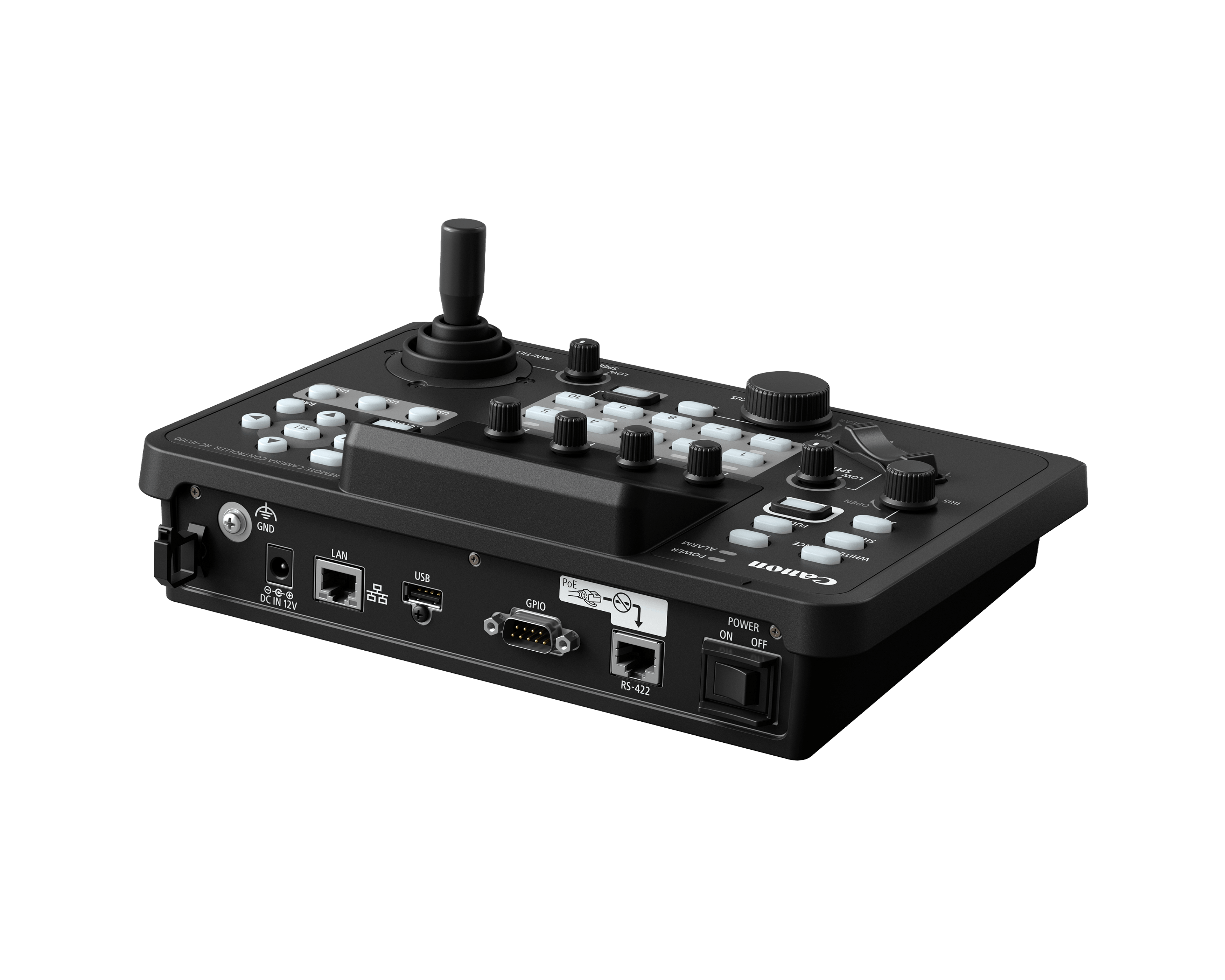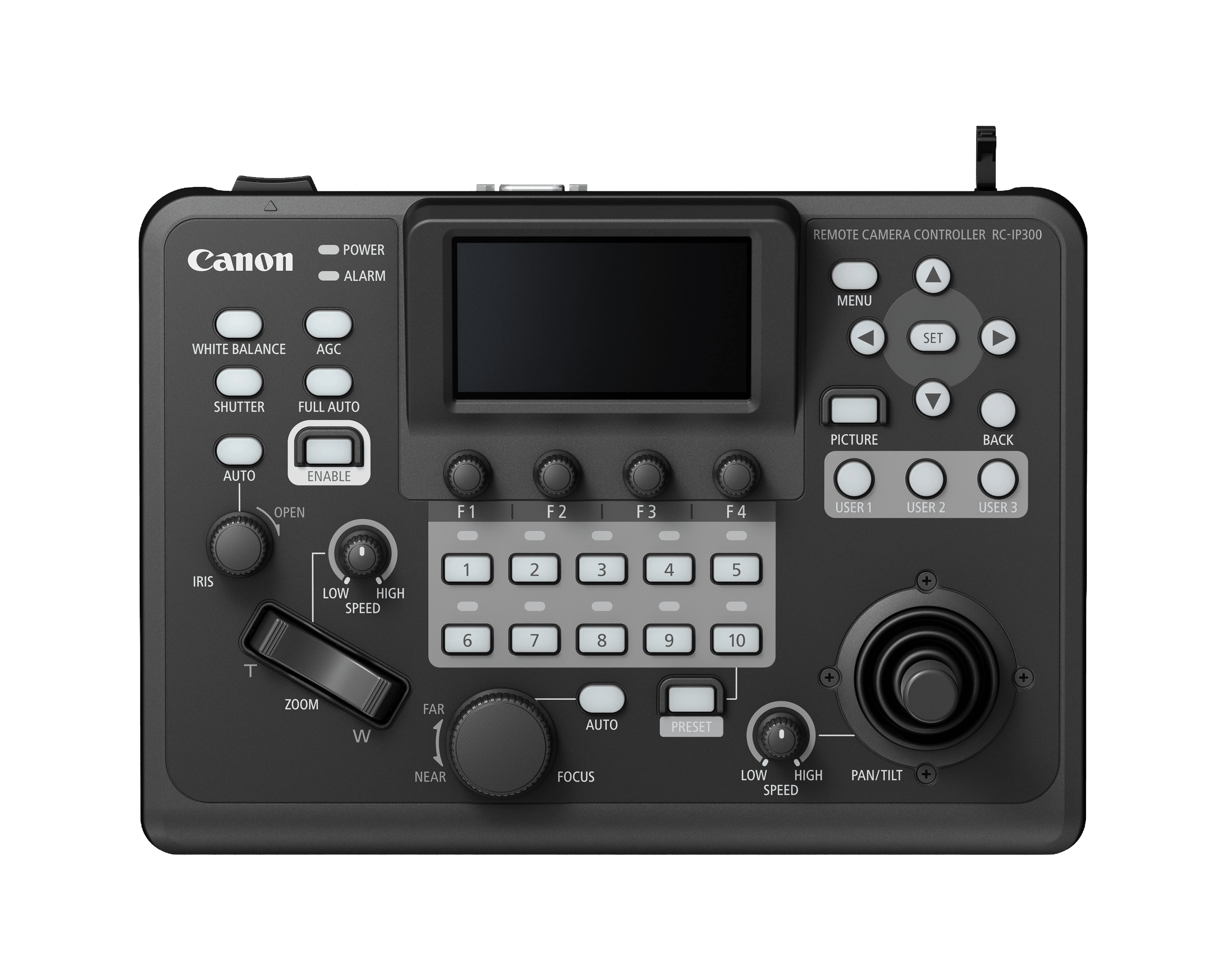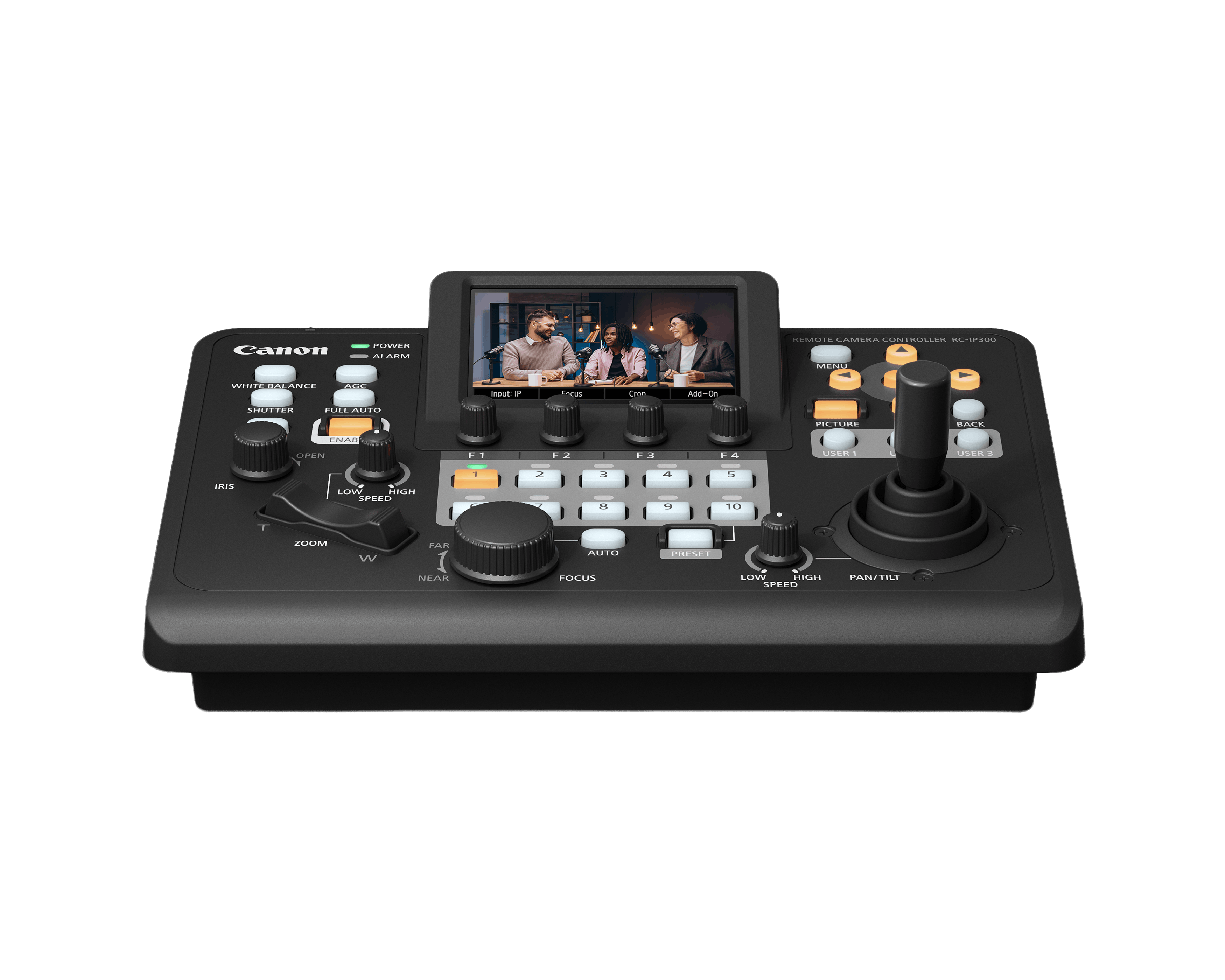 The RC-IP300 supports up to 200 cameras and incorporates many of the advanced features found in the flagship RC-IP1000 but in a smaller, more portable form. It includes a 3.5-inch touchscreen for multi-camera live video monitoring over IP, with touch autofocus control and intuitive subject selection for Auto Tracking. It also offers seamless configuration of camera image and camera system settings directly from the controller. Physical controls feature dedicated dials and buttons for pan/tilt, focus, zoom, iris, and separate speed adjustments, plus 12 user-assignable buttons (3 hard buttons) and 4 function buttons with 4-way menu navigation.